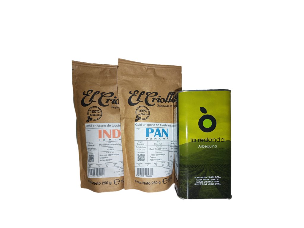 Zloženie: čerstvo pražená zrnková káva, 100% arabika, extra panenský olivový olej LA REDONDA Arbequina